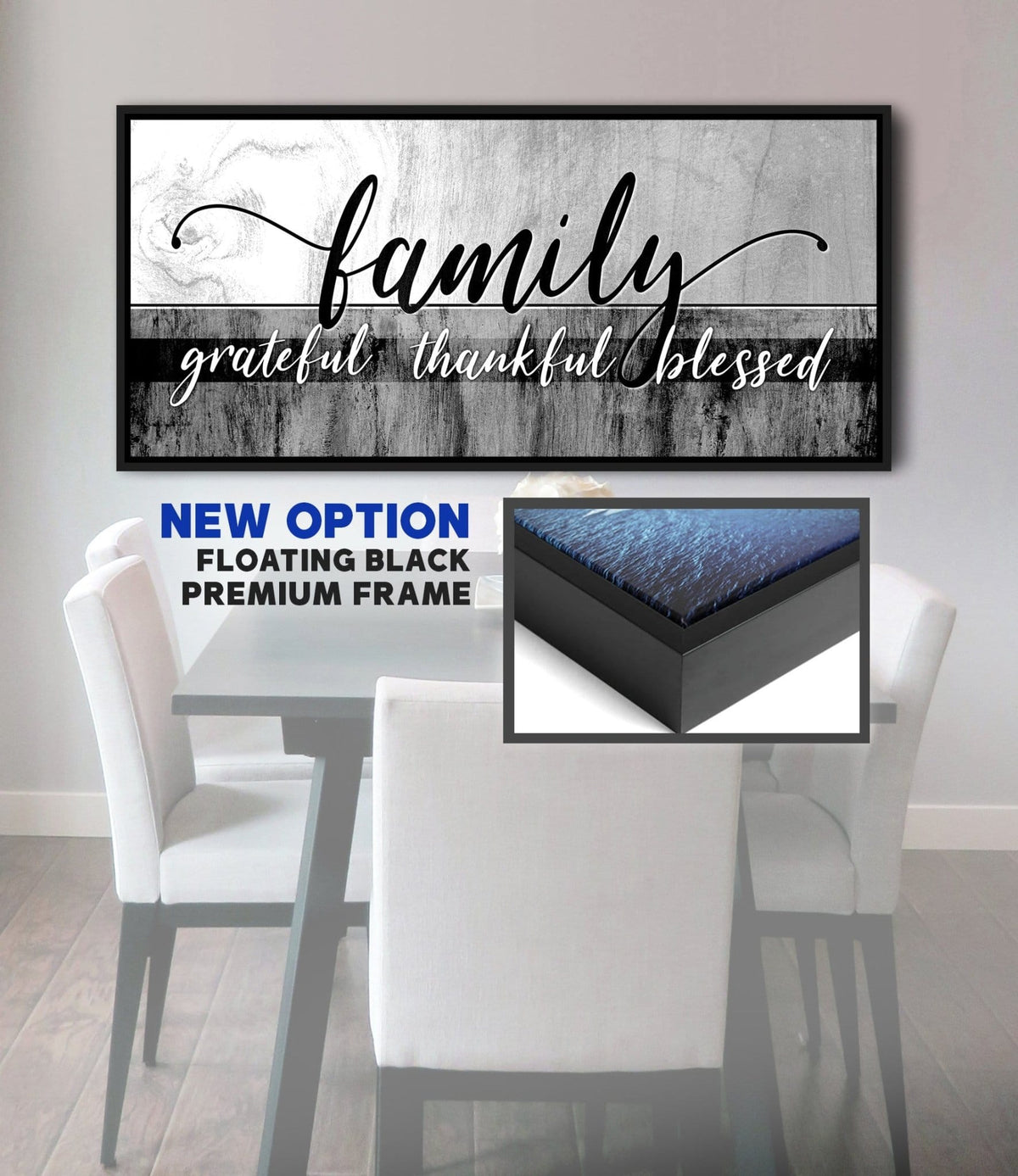 Family Wall Art: Family Grateful Thankful Blessed - Rustic Christian Canvas - 42W X 19H Inch Large Wood Frame / Brown