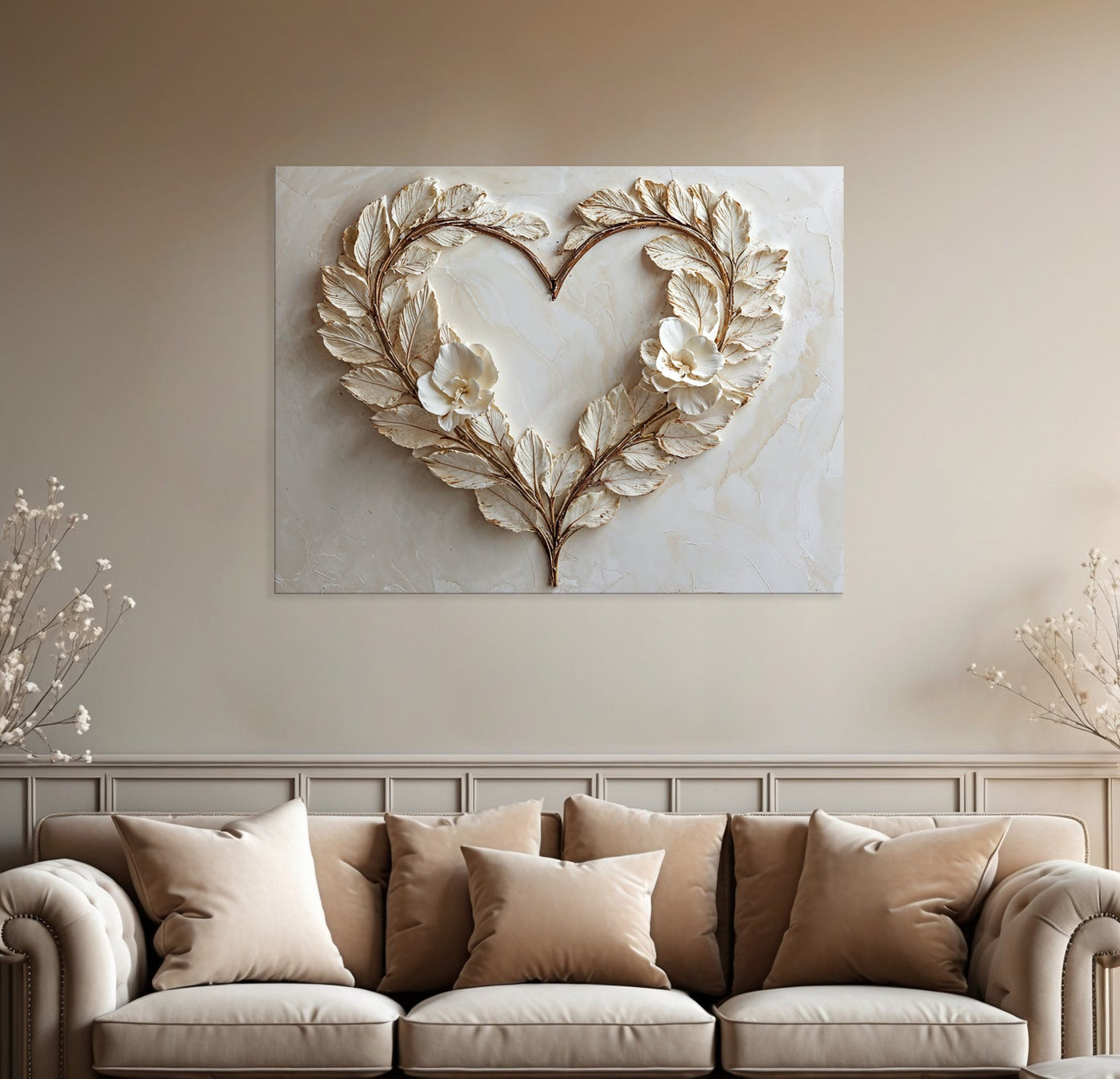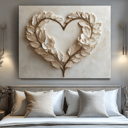 Romantic Leaf Heart Wall Art – Elegant Neutral Floral Canvas for Bedroom Decor - Classic Canvas / 48W x 36H inch Large Wood Frame