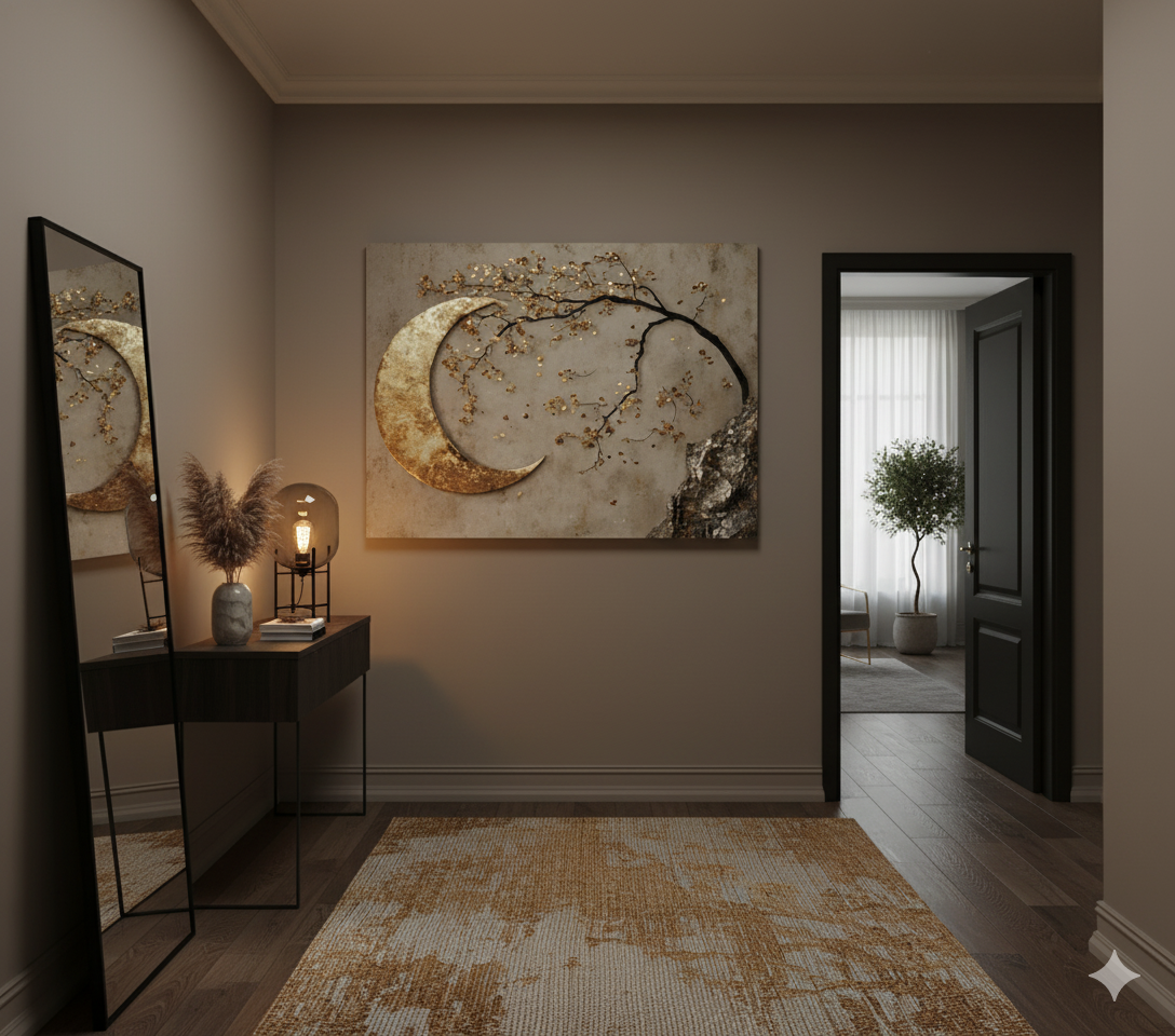 Transform your walls with the mystique of the Enchanted Moonrise Wall Art. This stunning artwork features a shimmering golden crescent moon gracefully embraced by a blossoming branch, set against a rich and timeless backdrop. Perfect for adding a luxurious, serene atmosphere to any room.
