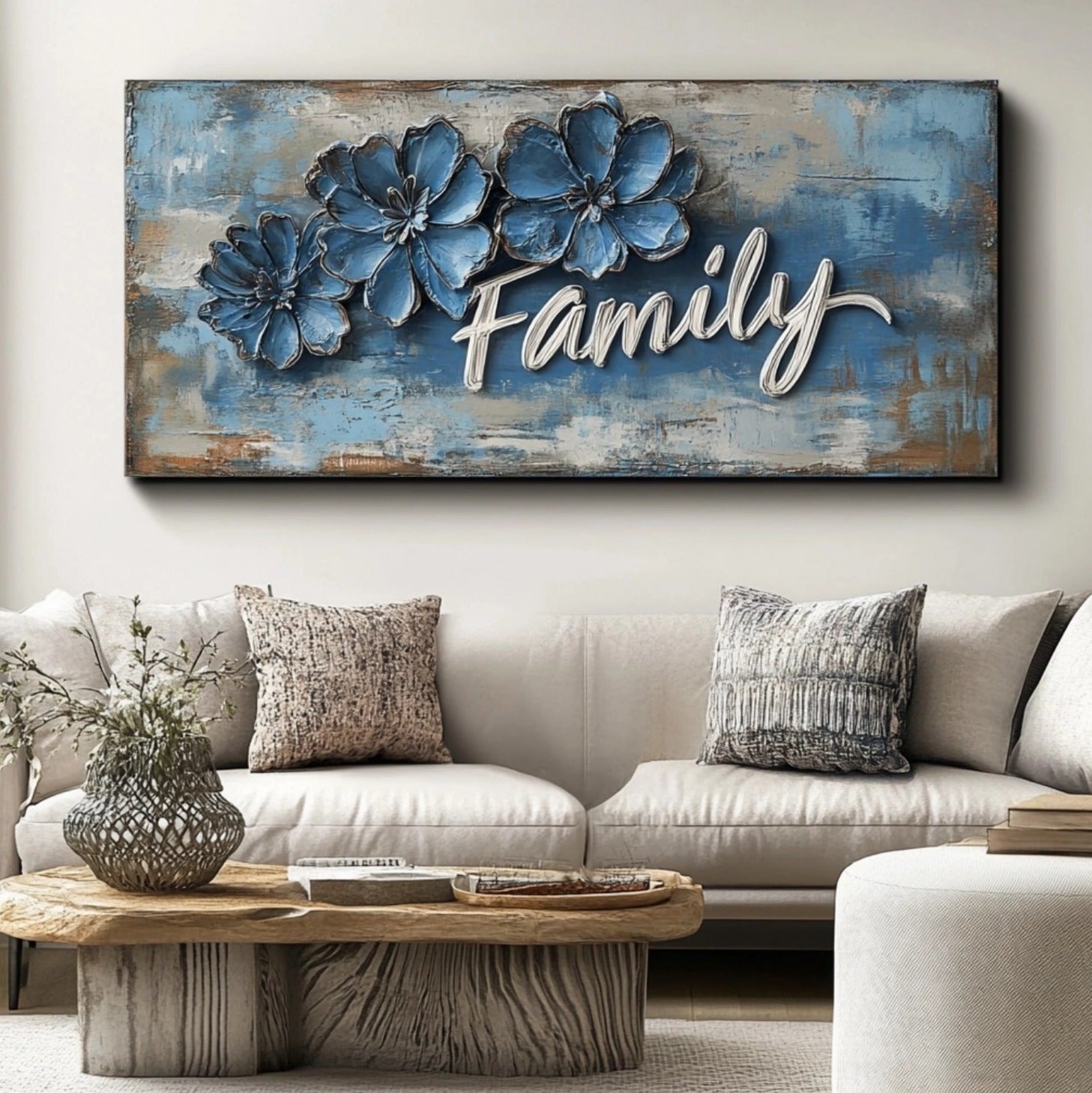 Perfect for your living room, dining area, or entryway, this artwork serves as a daily reminder that home is where love grows. The soft blue tones and handcrafted texture create a soothing, welcoming ambiance—ideal for families who cherish meaningful décor with style.