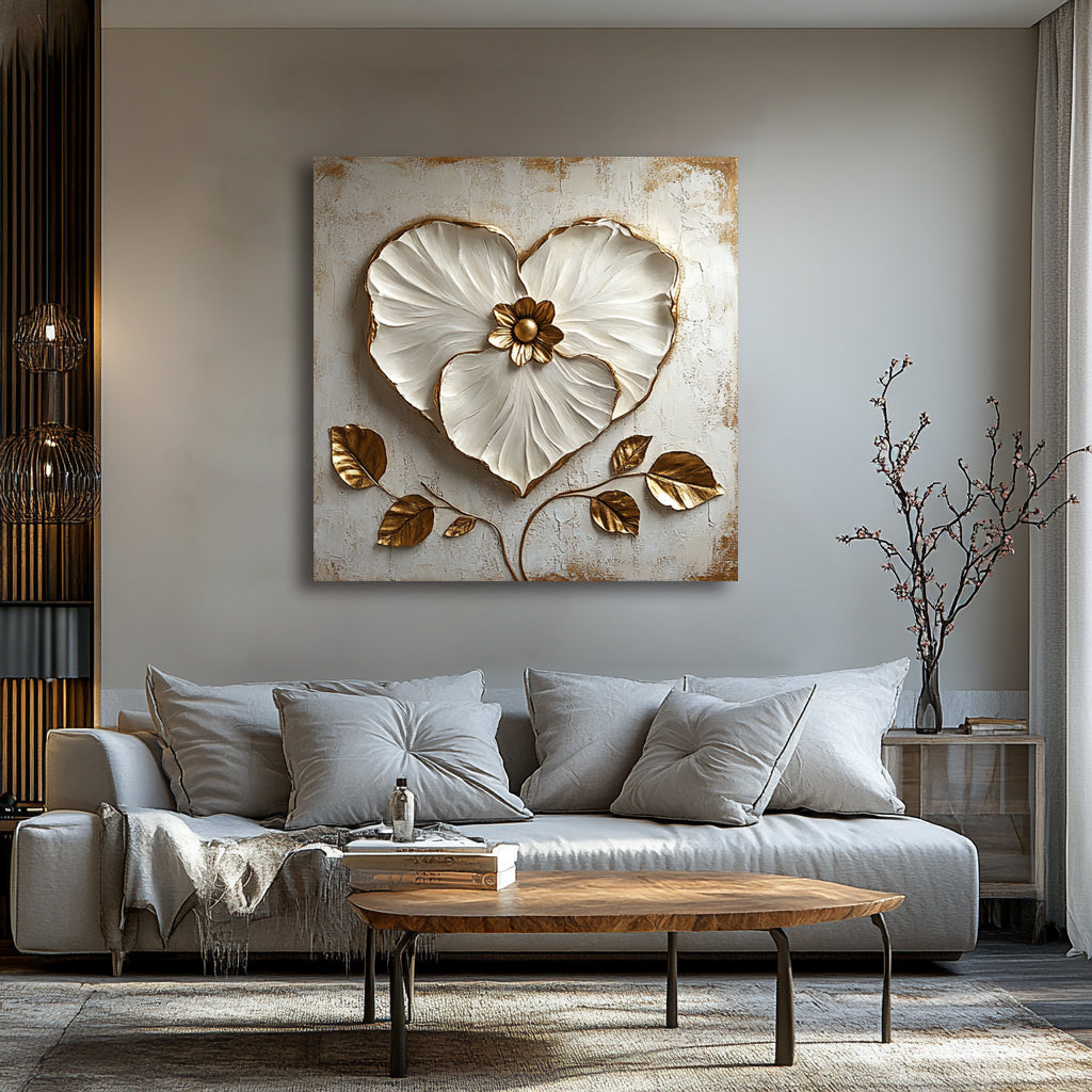 Heart Petal Floral Wall Art – Elegant Gold & White Canvas for Romantic and Modern Decor