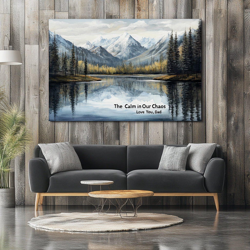 Celebrate the steady presence of your father with this stunning mountain lake wall art that beautifully says: "The Calm in Our Chaos – Love You, Dad." Surrounded by still waters, towering pines, and majestic snowcapped peaks, this canvas brings peaceful balance to any room while honoring the one who brings serenity to your life.