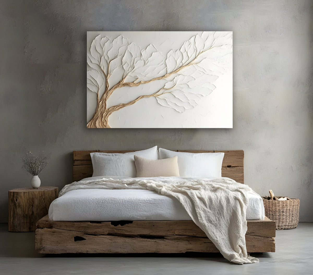 Neutral Bedroom Wall Art – Large Branch Canvas for Above Bed Decor | Modern Minimalist Wall Art - Classic Canvas / 48W x 32H inch Medium Wood Frame / White