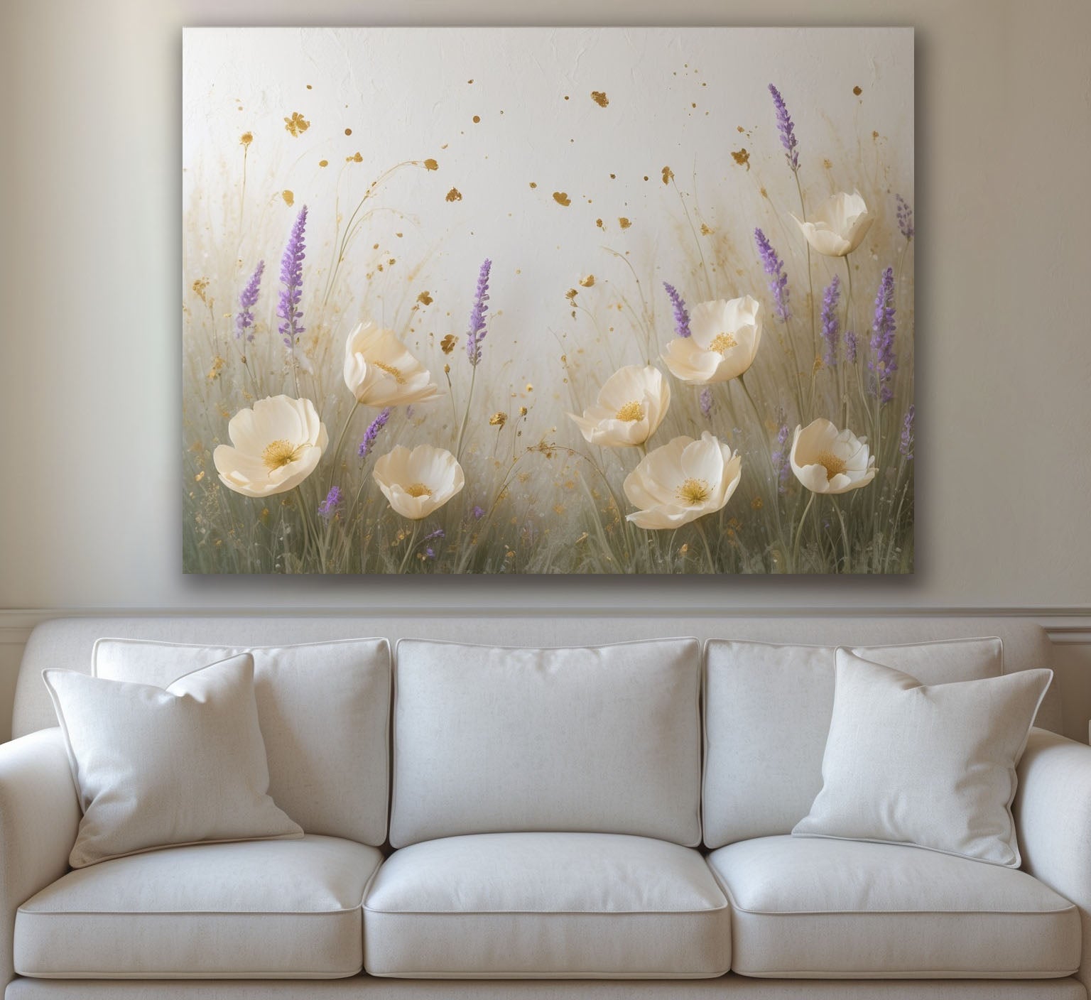 This stunning design features delicate white poppies and lavender stems swaying in the breeze, accented with soft green grass and scattered gold flecks. While it appears to have depth and texture, it is completely smooth to the touch, making it lightweight, easy to hang, and perfect for any room.